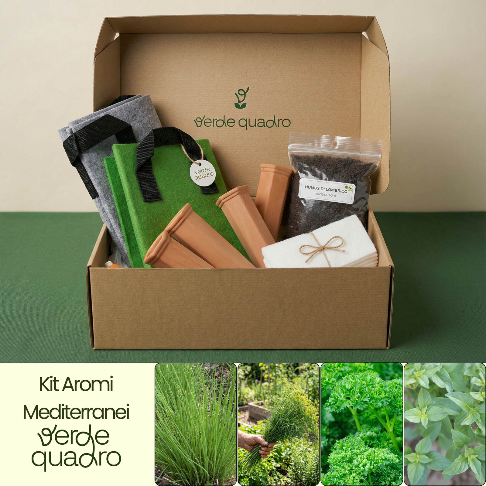 Il profumo del Mediterraneo, coltivato sul tuo balcone. Basilico limone, aneto, prezzemolo e erba cipollina: un quartetto aromatico che trasforma ogni piatto in qualcosa di speciale. Dal seme alla cucina, con un gesto semplice. Con il kit ricevi accesso al manuale digitale Verde Quadro con istruzioni passo passo e ricette ispirate.